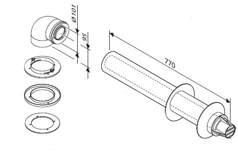 Vízszintes oldalsó füstcső 810 mm 90°-os könyökkel.