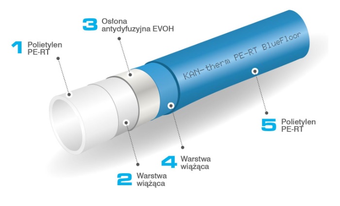 A csövek ötrétegű csövekként készülnek (PE-RT I. típusú polietilén – ragasztó – EVOH diffúziógátló réteg – ragasztó – PE-RT I. típusú polietilén), ahol az összes réteget véglegesen összekapcsolják a gyártási folyamat során. A megnövelt hőállóságú PE-RT polietilén használatának és a nagyfokú termékrugalmasságnak köszönhetően a KAN-therm Blue Floor csövek könnyen telepíthetők alacsony hőmérsékleten is. Az alkalmazott EVOH diffúziógátló bevonat garantálja a tömítettséget az oxigén behatolásával szemben a berendezés belsejében, védve az alkatrészeket a korróziótól.